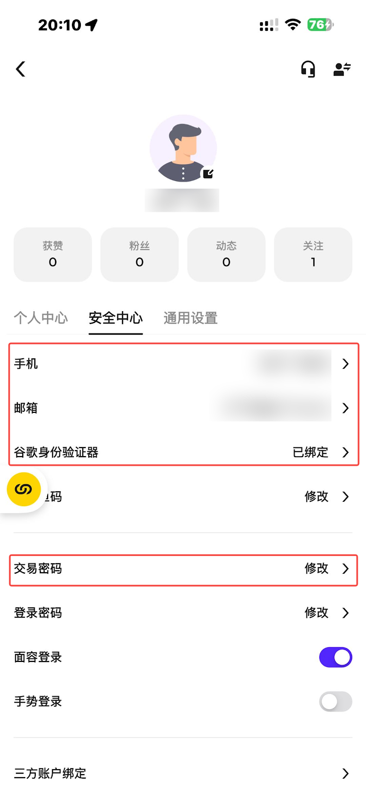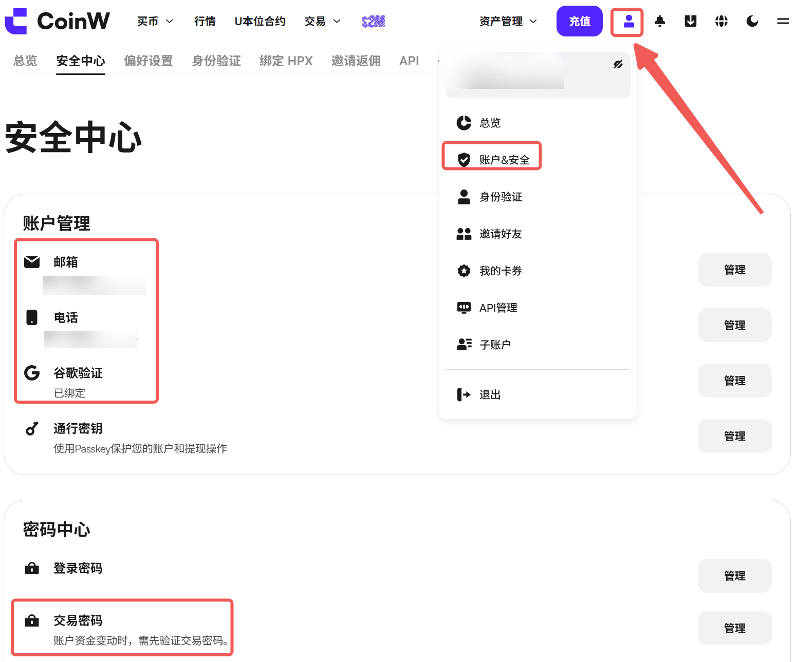 方式二,從 CoinW 劃轉,需要完成安全設置:CoinW App - 安全中心 - 完成手機或者谷歌驗証器 + 交易密碼 2 項