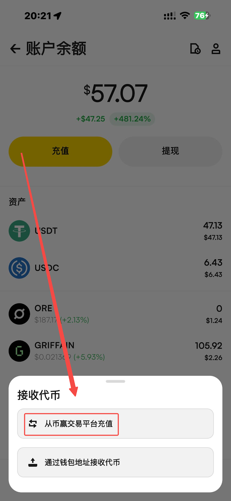 充值步驟:GemW 鏈上交易 - 資産 - 充值 - 從幣贏交易平颱充值 - 將加密貨幣資産充值到 GemW 賬戶