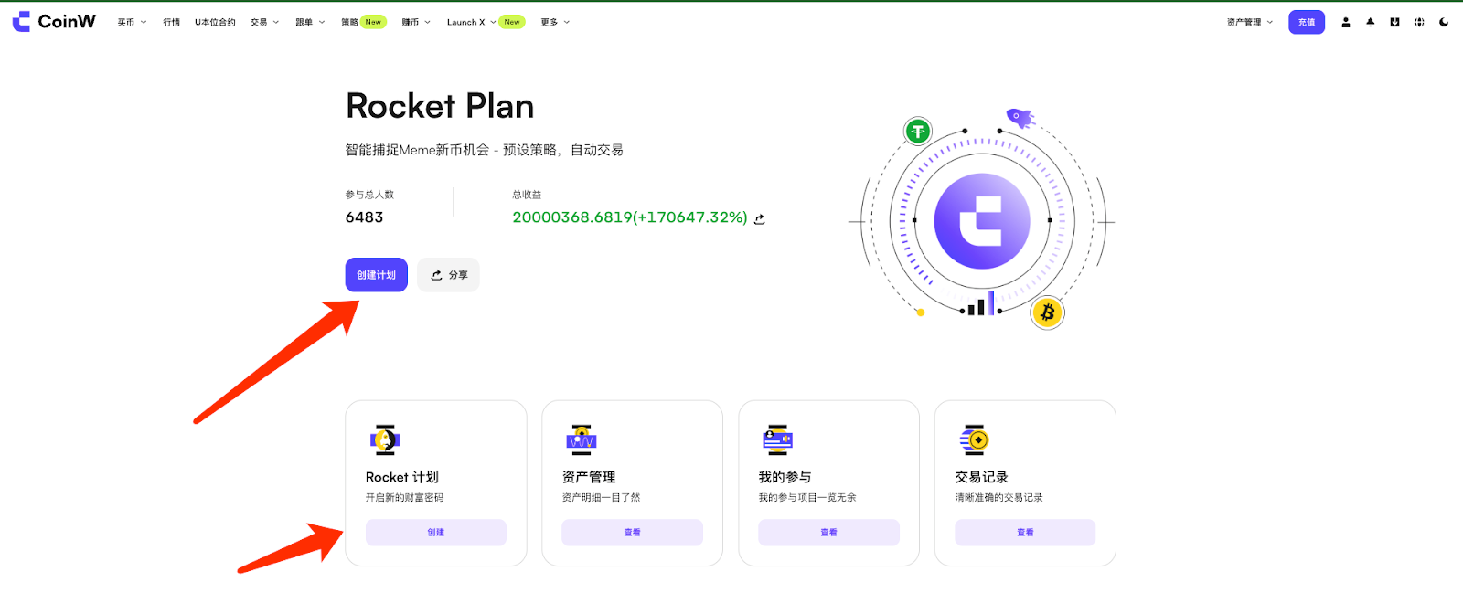 Rocket Plan是CoinW全新推出针对研究院研选新币的策略交易产品,用户可在新币上线之前使用Rocket Plan设置策略参数,待新币上线后根据用户自行设定的策略参数自动执行交易,无须时刻关注新币上线时间,轻松交易新币!