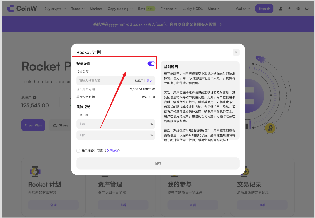 用户可随时终止Rokcet计划,通过Rocket计划页面,点击“创建”进入设置界面,关闭投资设置即可直接终止该计划并自动划转剩余资产至现货账户。