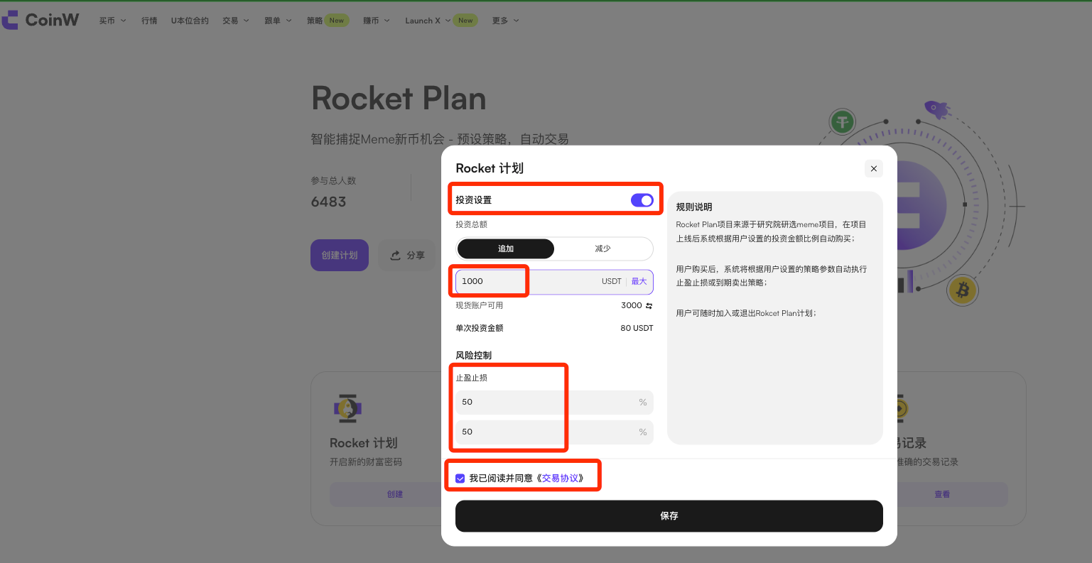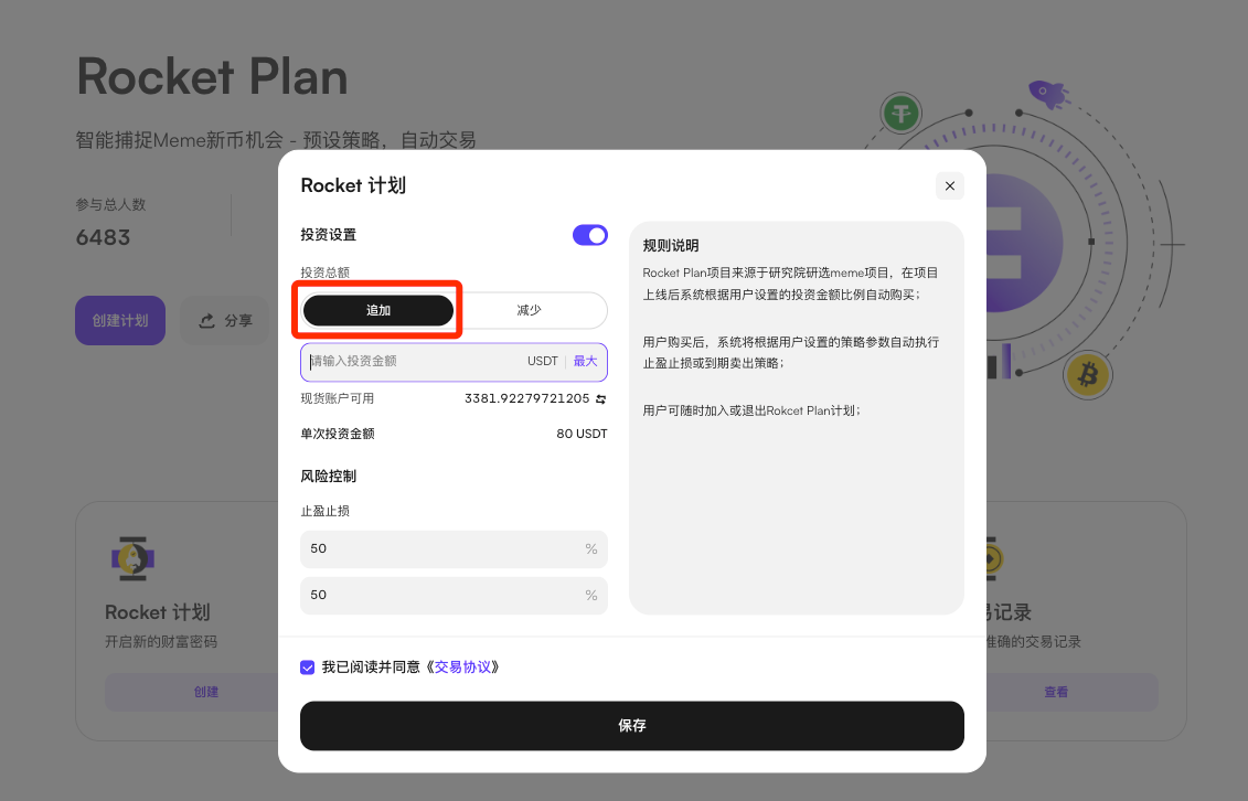 Rocket Plan按照用户设置的投资额、止盈止损比例,自动运行新币的交易策略。系统仅根据用户已设置的参数自动提交买入或卖出指令,不对市场行情作出预测或判断。