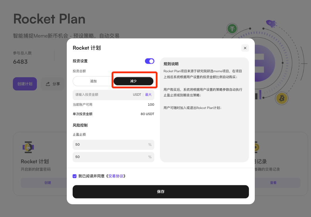 另该页面还有减少投资额的功能,支持用户减少USDT投资额,若将投资额减少至0,则Rocket计划终止。